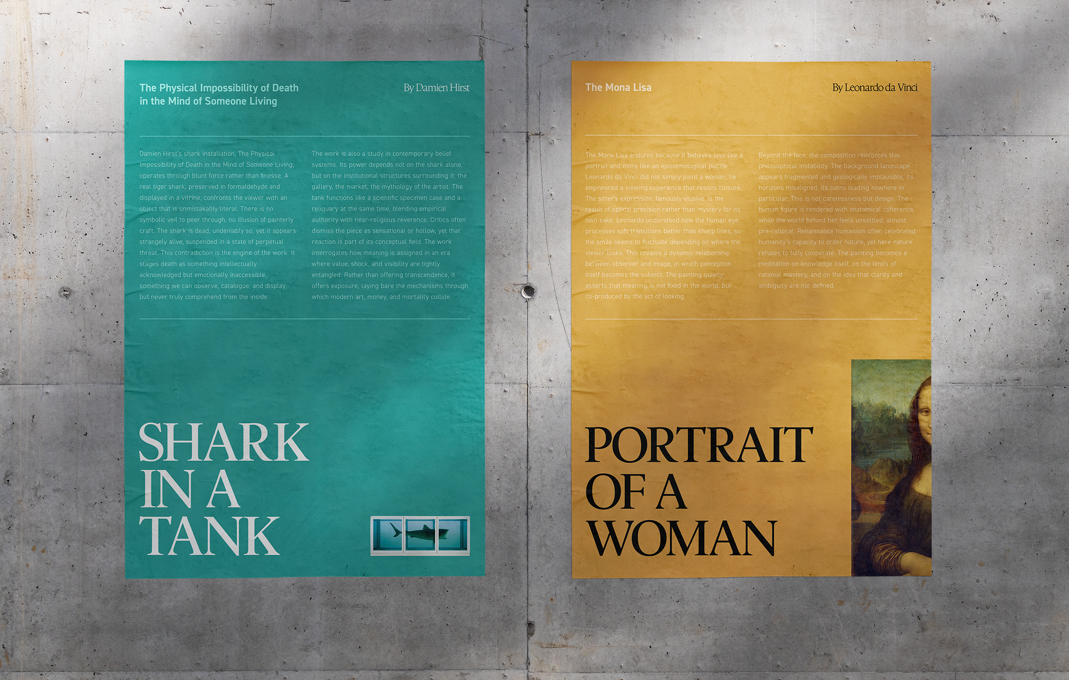 The work deliberately undermines the hierarchy of information. Blatantly oversimplified titles and authorship are elevated through heavy serif display typography, while explanatory text is demoted, dense, and visually sabotaged. This reversal questions what we are conditioned to value when encountering art.